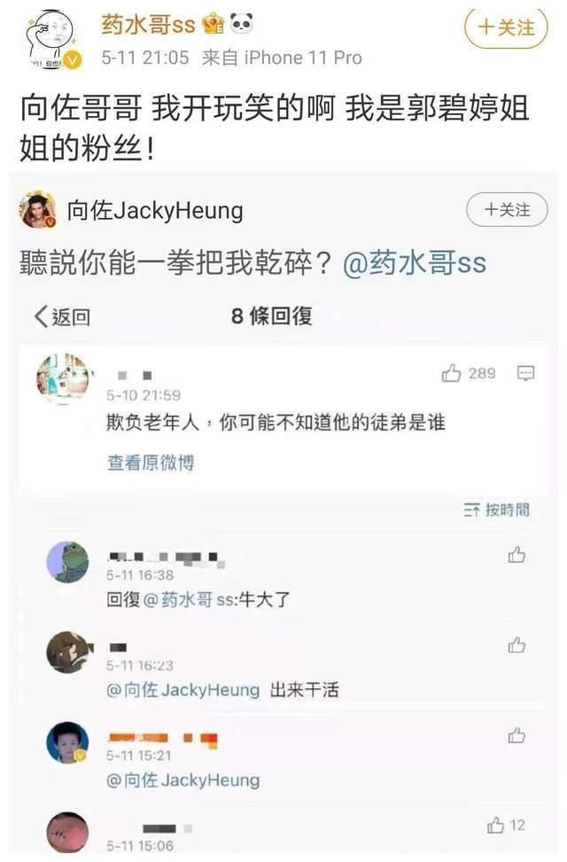 本来药水哥只是随便玩玩而已,没想到的是向佐直接回应了他说“你能一拳把我干碎?”,然后这个时候的药水哥看到了直接秒怂了,回应说他是郭碧婷粉丝。大家也都笑翻了,没想到药水哥也是一个怂货,竟然立刻没有下文了,这也很符合他的性格,不过之后的操作也很有趣,不得不和向佐道歉,还顺势夸赞了郭碧婷。